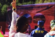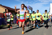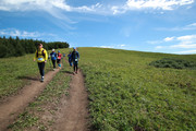 8月14日,越野爱好者进行马拉松越野赛前的热身运动。